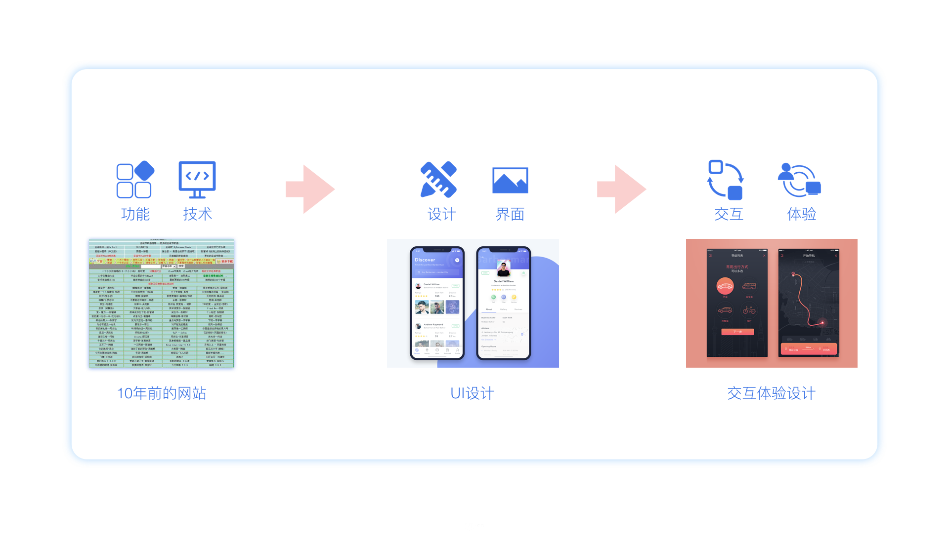舉個(gè)例子:十年前,網(wǎng)站盛行,技術(shù)當道。那時(shí)候對于用戶(hù)來(lái)說(shuō)更關(guān)注的是功能,網(wǎng)站使用過(guò)程中體驗的更多的是有沒(méi)有這個(gè)功能,能不能使用等。當網(wǎng)站發(fā)展到一定程度后,人們的焦點(diǎn)從功能轉移到外觀(guān),這時(shí)候出現了大量的UI設計師。到最后人們的焦點(diǎn)又從外觀(guān)轉移到體驗的時(shí)候,這時(shí)才真正的出現了所謂的交互設計。