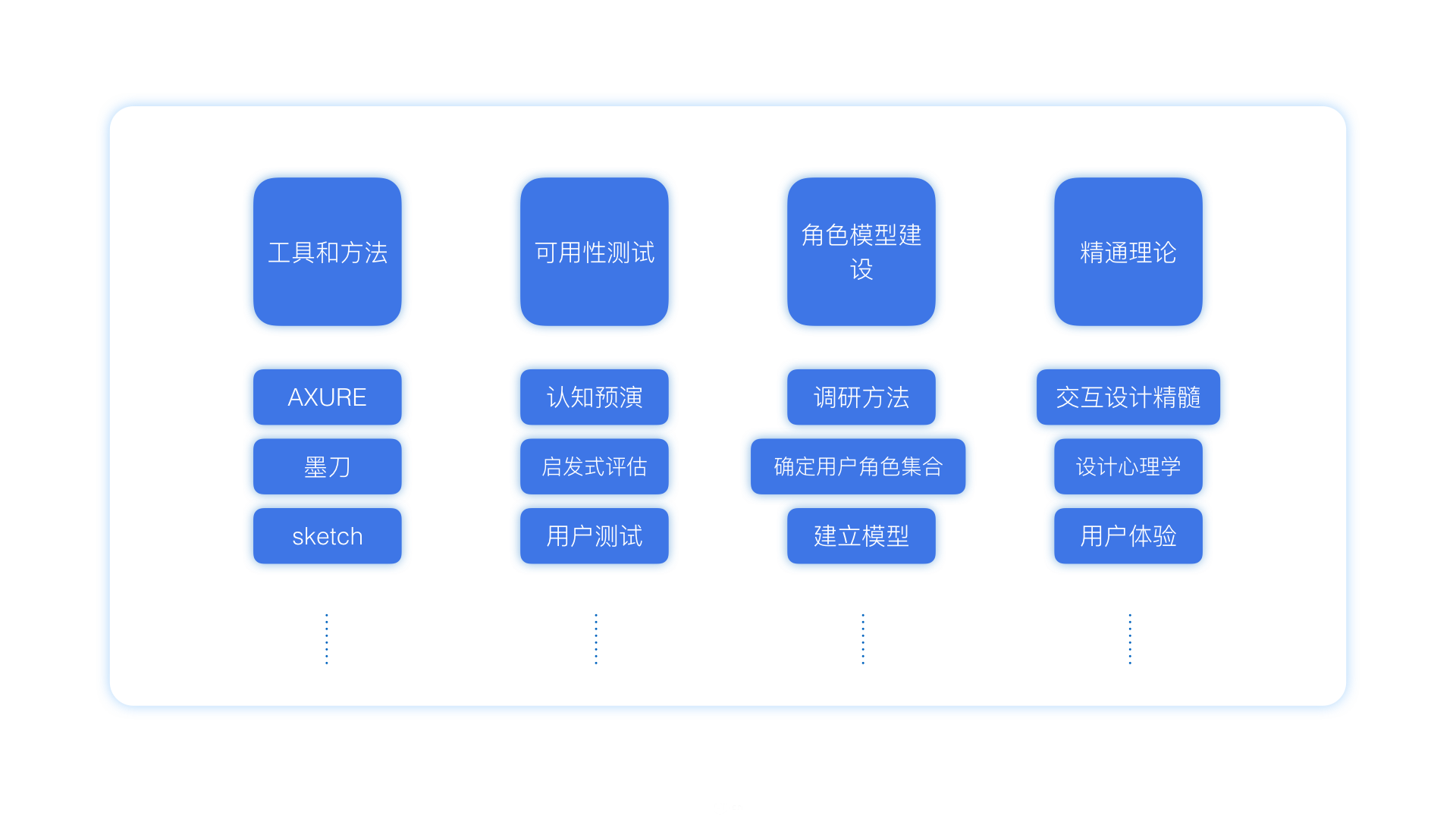 我覺(jué)得交互設計師應該需要熟練掌握交互工具和方法(Axure、可用性測試、角色模型建設,或者精通各種理論),我們需要從4個(gè)方面不斷的提升自己。