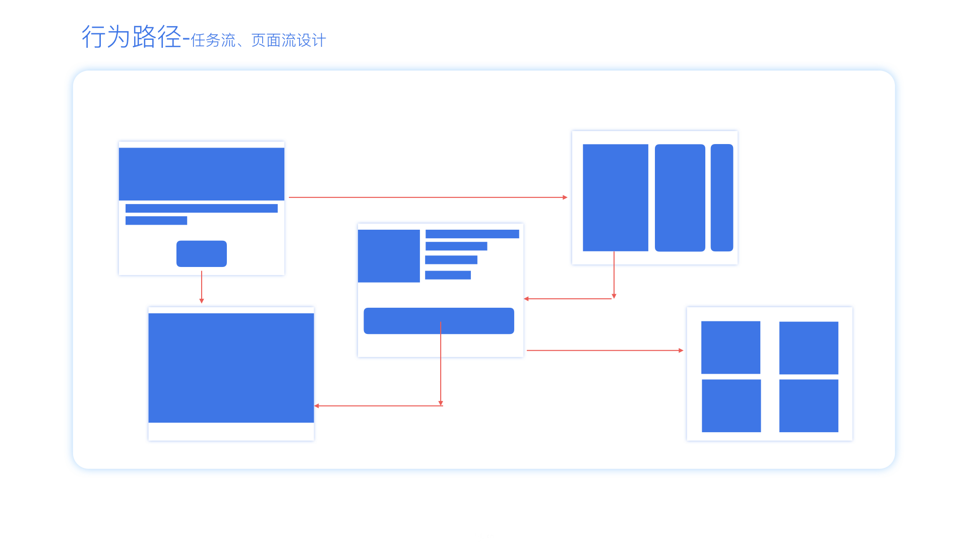 1.行為路徑-通常稱(chēng)之為頁(yè)面流程圖(Page Flow),主要是關(guān)注任務(wù)流和頁(yè)面流的設計,讓用戶(hù)在使用過(guò)程中,頁(yè)面跳轉流暢,用戶(hù)使用無(wú)障礙,并且提高了讓用戶(hù)達到產(chǎn)品目標的效率。在這個(gè)步驟中,頁(yè)面通常不用很好看,只要講清楚任務(wù)流,業(yè)務(wù)流即可。主要就是講清楚產(chǎn)品主要功能流程就行。